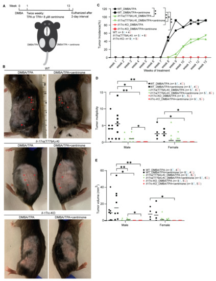 The thickness sum of stratum granulosum, stratum spinosum, and stratum basalis was quantified to represent hyperplasia of keratinocytes. In male mice, the proliferation of keratinocytes was hindered by Il17rc-KO, but not Il17ra(T779A)-KI. Topical administration of centrinone could not inhibit the proliferation of keratinocytes induced by DMBA/TPA (Figure 7A,B). However, an opposite phenotype alteration was observed in female mice, which showed that centrinone treatment favored the reduction of epidermis thickening of Il17rc-KO mice compared with Il17ra(T779A)-KI mice. However, the difference of keratinocyte proliferation between WT and Il17rc-KO did not show any statistical significance (Figure 7A,C). Pronounced tumor formation was observed in WT and Il17ra(T779A)-KI mice, but no tumors developed in the Il17rc-KO mice (Figure 7D).