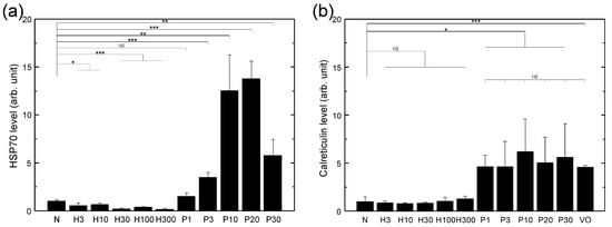 Figure 1. Surface HSP70 (a) and calreticulin (b) expressions of LLC cells treated with various sources of oxidative stress after 24 h of recovery time. The HSP70 and calreticulin levels were normalized to that of the respective control group (N). N: medium only; H3, H10, H30, H100, H300: treated with 3, 10, 30, 100, and 300 μ M H 2 O 2 respectively; P1, P3, P10, P20, P30: treated with PDT using 4 μ g/mL of verteporfin and a light fluence of 1, 3, 10, 20, and 30 J/cm 2 , respectively; VO: verteporfin only (without light). Data are expressed by mean ± SD (N = 4), NS: no significant difference, *: p-value < 0.05, **: p-value < 0.01, and ***: p-value < 0.001.