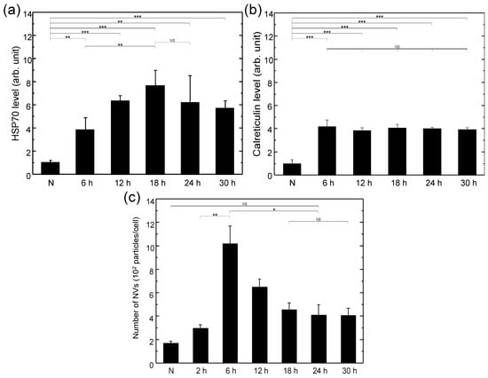 Figure 2. (a) Surface HSP70 expression of LLC cells as a function of recovery time after PDT treatment with 4 μ g/mL of verteporfin and 10 J/cm 2 fluence. The HSP70 level was normalized to that of the control group (N). N: without PDT treatment. (b) Surface calreticulin expression of LLC cells as a function of recovery time after PDT treatment with 4 μ g/mL of verteporfin and 20 J/cm 2 fluence. The calreticulin level was normalized to that of the control group (N). N: without PDT treatment. (c) The number of spontaneously released nanovesicles as a function of time after PDT treatment. N: number of nanovesicles spontaneously released from LLC cells in a time span of 24 h without PDT treatment. Data are expressed by mean ± SD ((a) N = 4, (b) N = 4, (c) N = 3), NS: no significant difference, *: p-value < 0.05, **: p-value < 0.01, and ***: p-value < 0.001.