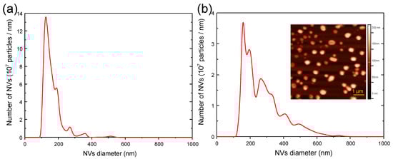 Figure 3. Size distributions of nanovesicles (NVs) produced by (a) spontaneous release and (b) filter extrusion, respectively, following PDT treatment of LLC cells with 4 μ g/mL of verteporfin, 20 J/cm 2 light fluence, and 24 h of recovery time, measured with NTA. LLC cell number: 2.2 × 10 7 . Inset of (b): morphology of nanovesicles produced by filter extrusion and measured with AFM.