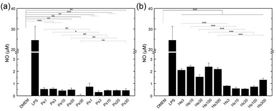 Figure 4. NO secretion of macrophages measured at 24 h after being treated with various vaccines produced by PDT (a) or H 2 O 2 (b) through spontaneous release or filter extrusion. DMEM: medium only; LPS: with 100 ng/ml lipopolysaccharide (LPS); Pe1, Pe3, Pe10, Pe20, Pe30: vaccines prepared using PDT with 4 μ g/mL of verteporfin and a light fluence of 1, 3, 10, 20, and 30 J/cm 2 , respectively, followed by filter extrusion after 24 h of recovery time; Ps1, Ps3, Ps10, Ps20, Ps30: vaccines prepared using PDT with 4 μ g/mL of verteporfin and a light fluence of 1, 3, 10, 20, and 30 J/cm 2 , respectively, with the supernatant collected after 24 h of recovery time; He3, He10, He30, He100, and He300: vaccines prepared using 3, 10, 30, 100, and 300 μ M H 2 O 2 , respectively, followed by filter extrusion after 24 h of recovery time; Hs3, Hs10, Hs30, Hs100, and Hs300: vaccines prepared using 3, 10, 30, 100, and 300 μ M H 2 O 2 , respectively, with the supernatant collected after 24 h of recovery time. For the vaccine groups, each well contained 1 × 10 5 macrophages, and the nanovesicle vaccines made from 5.2 × 10 6 LLC cells. Data are expressed by mean ± SD (N = 4), NS: no significant difference, *: p-value < 0.05, **: p-value < 0.01, and ***: p-value < 0.001.