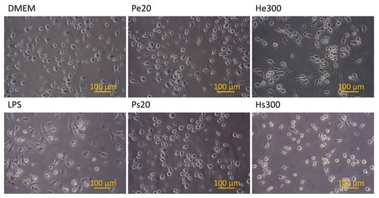 Figure 5. Morphology of macrophages after incubation with various vaccines for 24 h. DMEM: medium only; LPS: with 100 ng/mL lipopolysaccharide; Pe20: vaccine prepared using PDT with 4 μ g/mL of verteporfin at 20 J/cm 2 fluence followed by filter extrusion after 24 h of recovery time; Ps20: vaccine prepared using PDT with 4 μ g/mL of verteporfin at 20 J/cm 2 fluence, with the supernatant collected after 24 h of recovery time; He300: vaccine prepared using 300 μ M H 2 O 2 followed by filter extrusion after 24 h of recovery time; Hs300: vaccine prepared using 300 μ M H 2 O 2 , with the supernatant collected after 24 h of recovery time. Each dish contained 3 × 10 5 macrophages, and the nanovesicle vaccine made from 5.2 × 10 6 LLC cells.