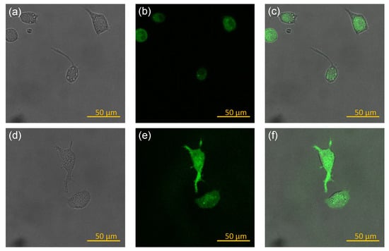 Figure 6. NO staining of macrophages at 24 h after being treated with 100 ng/mL of LPS: (a,d) optical microscopy images; (b,e): confocal microscopy images; (c,f): superposition of the two.