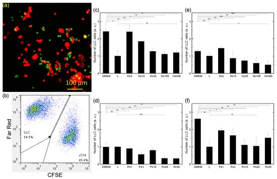 Figure 7. Numbers of viable LLC cells after co-culturing with macrophages and treated with various vaccines for 48 h. (a) Fluorescence image of the co-cultured LLC cells (red) and macrophages (green) at 48 h after plating without any vaccine. (b) Flow cytometry dot graph of the co-cultured LLC cells (Far Red) and macrophages (CFSE) at 48 h after plating without adding the vaccine. (c) Comparison of H 2 O 2 -extrusion vaccines with various doses. (d) Comparison of PDT-extrusion vaccines with various doses. (e) Comparison of H 2 O 2 -supernatant vaccines with various doses. (f) Comparison of PDT-supernatant vaccines with various doses. The initial ratio of the number of LLC cells and macrophages was 1:2. DMEM: without the vaccine; L: without macrophages and vaccines; He3, He10, He30, He100, and He300: vaccines prepared using 3, 10, 30, 100, and 300 μ M H 2 O 2 , respectively, followed by filter extrusion after 24 h of recovery time; Hs3, Hs10, Hs30, Hs100, and Hs300: vaccines prepared using 3, 10, 30, 100, and 300 μ M H 2 O 2 , respectively, with the supernatant collected after 24 h of recovery time; Pe1, Pe3, Pe10, Pe20, and Pe30: vaccines prepared using PDT with 4 μ g/mL of verteporfin and a light fluence of 1, 3, 10, 20, and 30 J/cm 2 , respectively, followed by filter extrusion after 24 h of recovery time; Ps1, Ps3, Ps10, Ps20, and Ps30: vaccines prepared using PDT with 4 μ g/mL of verteporfin and a light fluence of 1, 3, 10, 20, and 30 J/cm 2 , respectively, with the supernatant collected after 24 h of recovery time. Each dish contained 1.5 × 10 5 LLC cells, 3 × 10 5 macrophages (if added), and the nanovesicle vaccine made from 5.2 × 10 6 LLC cells. Data are expressed by mean ± SD (N = 4), NS: no significant difference, *: p-value < 0.05, **: p-value < 0.01, and ***: p-value < 0.001.