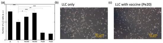 Figure 8. Numbers of viable LLC cells after being treated with various vaccines for 48 h in the absence of macrophages. (a) Comparison of various vaccines. JL: without the vaccine but with the macrophage; L: without the vaccine; He300: vaccine prepared using 300 μ M H 2 O 2 followed by filter extrusion after 24 h of recovery time; Hs300: vaccine prepared using 300 μ M H 2 O 2 with the supernatant collected after 24 h of recovery time; Pe20: vaccine prepared using PDT with 4 μ g/mL of verteporfin and a light fluence of 20 J/cm 2 followed by filter extrusion after 24 h of recovery time; Ps20: vaccine prepared using PDT with 4 μ g/mL of verteporfin and a light fluence of 20 J/cm 2 , with the supernatant collected after 24 h of recovery time. Data are expressed by mean ± SD (N = 4), NS: no significant difference, *: p-value < 0.05, **: p-value < 0.01, and ***: p-value < 0.001. (b) Morphology of LLC cells without treatment by the vaccine. (c) Morphology of LLC cells after being treated by the vaccine prepared using PDT with 4 μ g/mL of verteporfin and a light fluence of 20 J/cm 2 followed by filter extrusion after 24 h of recovery time. Each dish contained 1.5 × 10 5 LLC cells, 3 × 10 5 macrophages (if added), and the nanovesicle vaccine made from 5.2 × 10 6 LLC cells.