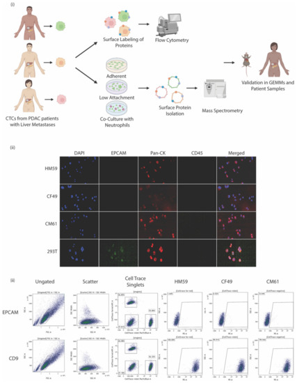 Several PDAC CTC cell lines isolated from patients with metastatic cancer were first probed for the expression of surface EpCAM by labeling cells with PE-conjugated anti- EpCAM antibodies. We identified three CTC lines that were negative for EpCAM but were cytokeratin-positive. Attentive care was taken to allow for representation across the Hispanic and Caucasian populations: cell lines were taken from Caucasian female and male patients aged 49 and 61 years, respectively, as well as from a Hispanic male patient aged 59 years. This assisted in providing an unbiased analysis of surface protein expression across different sample populations. A pipeline of the experimental design of the study is shown in Figure 1i. These CTC cell lines had a characteristic of differentiating into two subtypes of cells in culture that could not be separated; single cell sorting would eventually give rise to the other cell type. Immunofluorescent labeling of the cells indicated they were CK+/CD45- (Figure 1ii).