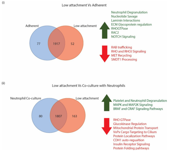(i) Venn distribution of proteins identified in CM61 CTC cultured in adherent and non-adherent conditions along with cellular processes that are upregulated in green and downregulated in red. (ii) Venn distribution of proteins identified in CM61 CTC cultured in low attachment and in co-culture with naïve neutrophils along with cellular processes that are upregulated in green and downregulated in red.