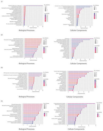 When the same analysis was performed with upregulated proteins in co-culture conditions with naïve neutrophils, the resulting enriched biological processes were proteins involved in NADH regeneration and metabolism as well as SRP-dependent co-translational proteins targeting the membrane and ER. These proteins belonged to the Ficolin-1 rich granule lumen, cytosolic ribosome, and melanosome cellular components. This could also be indicative of contamination by ribosomal proteins in the immunoprecipitation with beads, which is a very common problem associated with such methods. Proton-transportation of ATP synthase, proton channel activity, and vinculin cadherin and actin filament binding molecular functions were highly enriched. Among the downregulated genes, several biological processes that regulate myeloid cell activation or degranulation were enriched in addition to processes that control exocytosis, secretion, and protein localization. The cellular components that were enriched were the spliceosome complex or multiple vesicle lumens (Figure 3). A complete list of statistically significant GO annotations is shown in Supplementary File S5.