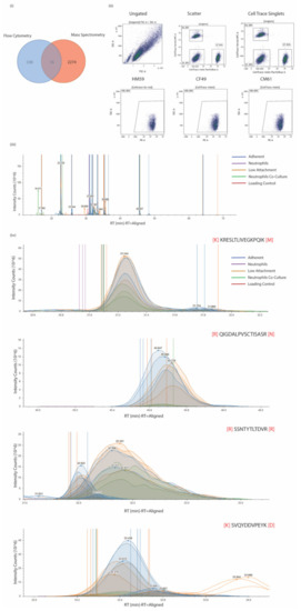 Comparative analysis of protein markers that were identified and detected reliably among all three cell lines (CF49, CM61, and HM5) as well as in the surface proteome of CM61 cells cultured under differing culture conditions was performed. All proteins identified from the mass spectrometric studies in all three conditions were looked into and compared with proteins identified from the flow cytometry screens. In total, we identified 2290 proteins by MS and 354 by flow cytometry (Figure 4i). ALCAM (CD166) was identified as a common marker that appeared in both experimental conditions. ALCAM is a cell adhesion molecule that is known to mediate both heterotypic cell–cell contacts via interaction with CD6 or by establishing homotypic cell–cell contacts. It is a member of the immunoglobulin receptor subfamily with five immunoglobulin-like domains. It has a long extracellular domain (528 amino acids) with a transmembrane region as well as a short cytoplasmic domain (33 amino acids). There are two known isoforms, “short” and “long”, differing in only a stretch of 12 negatively charged amino acids located in the extracellular domain. The two variants are produced by alternate splicing and are differentially susceptible to cleavage by ADAM metallopeptidase domain 17 or 10 (ADAM17/10) [82,83]. It was expressed in nearly 100% of the cell population among almost all of the three CTC lines that were analyzed (Figure 4i). On investigation of the expression levels in the different culture and co-culture conditions of CM61 CTC line, there were several peptides that were identified from ALCAM. Representative quantitation MS1 spectra of all peptides detected for ALCAM are shown in Figure 4ii, while MS2 fragmentation spectra of four ALCAM peptides are shown in Figure 4iii. The ALCAM peptides were detected in higher levels in cells that were cultured either in adherent or non-adherent conditions but did not show much variability. A biological assessment of expression would be in the co-culture conditions where the levels of the peptides show a more biological observable trend; however, these are higher in abundance compared to neutrophil levels of ALCAM, making it a suitable marker for assessment in PDAC CTCs. ALCAM is a potential biomarker that is minimally expressed on neutrophils but overrepresented in CTCs cultured in adherent, low attachment, and co-culture conditions.
