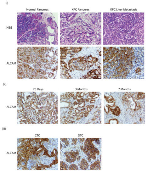 (i) H&E and Alcam staining of pancreas in C57BL6 and KPC GEMM mice with pancreatic cancer. Staining of liver metastasis in KPC GEMM mice (40× magnification); (ii) Alcam staining in KPC GEMM pancreas collected from mice that were 25 days, 2 months, and 7 months; (iii) Alcam staining in circulating tumor cell (CTC) and dissociated tumor cell (DTC) that were propagated in subcutaneous models (40× magnification).