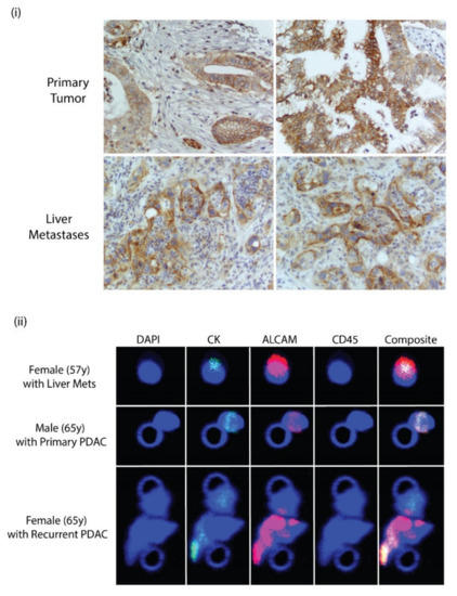 (i) ALCAM expression in human PDAC and liver metastases. (ii) Immunocytochemical staining of CTCs isolated from peripheral blood of patients with pancreatic cancer. CTCs were captured on Circulogix filters and stained for DAPI, cytokeratin, ALCAM, and CD45 along with a composite image of all stains. Patients were a 57-year-old female with liver mets, a 65-year-old-male with pancreatic ductal adenocarcinoma, and a 65-year-old female with a recurrent case of pancreatic ductal adenocarcinoma.