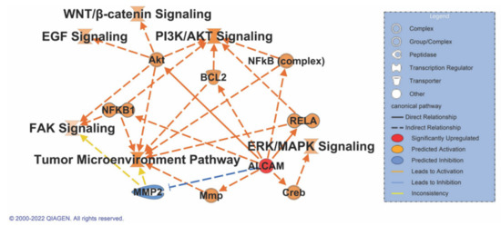 In order to investigate the role of ALCAM in pancreatic cancer signaling, an IPA Path Designer (Qiagen) analysis was performed. Common pathways that have a role in pancreatic cancer were taken into consideration: the EGF, FAK, WNT/β-catenin, PI3K/AKT, ERK/MAPK, and the tumor microenvironment pathways. A literature review indicates a direct association of ALCAM with increased activity and expression of AKT [84], RELA [85], and CREB [86]. Indirect associations are noted between the NFκB, FAK, PI3K/AKT, WNT-β-catenin, BCL2, and tumor microenvironment pathways. Hypothetical activation of ALCAM results in the activation of all the signaling pathways associated with cancer. There is, however, the inhibition of MMP2 that could result in the activation of the FAK signaling pathway or the tumor microenvironment pathway. Nonetheless, this last connection is inconclusive due to the lack of valid data points to determine its role in the molecule activity prediction algorithm (Figure 7). Enrichment details for pathways are provided in Supplementary File S6.