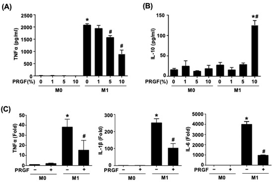 PRGF reduces both the secretion and expression of pro-inflammatory cytokines from M1 macrophages. (A) TNFα secretion decreased in M1 macrophages when treated with 5 and 10% PRGF compared to untreated M1 macrophages as checked by ELISA. (B) The concentration of anti-inflammatory cytokine IL-10 increased in M1 macrophages after treatment with 10% PRGF for 24 h. (C) The increases in mRNA expression levels of TNFα, IL-1β, and IL-6 in M1-induction media were inhibited by adding 10% PRGF as checked by qRT-PCR. n = 3. Significance was assessed by one-way ANOVA. Data are presented as the mean ± SEM. * p < 0.05 versus M0. # p < 0.05 versus M1.