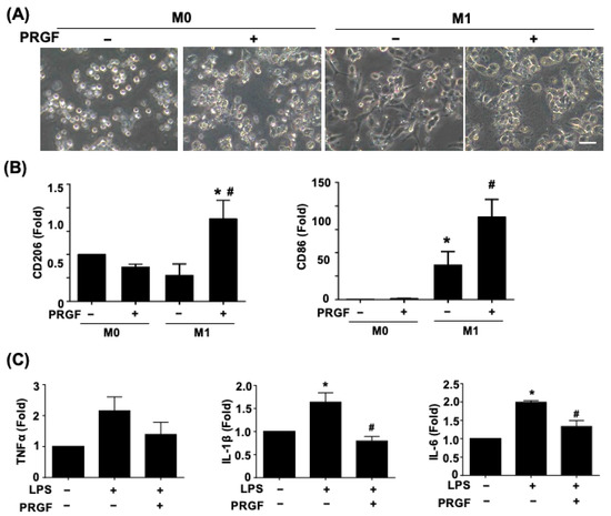 PRGF enhanced M2-macrophage polarization and inhibited the LPS-induced inflammatory SCs. (A) Representative phase images revealed a change in cell morphology of PRGF-treated M1 macrophages compared with M1 macrophages. (B) The qRT-PCR showed increases in the mRNA expression level for CD206 and CD86 by treating 10% PRGF with the M1-induction media. (C) The LPS-induced TNFα, IL-1β, and IL-6 expressions were inhibited when mixing with 10% PRGF in RT4 SCs. n = 4. Significance was assessed by one-way ANOVA. Data are presented as the mean ± SEM. For panel (B) histograms; * p < 0.05 versus M0. # p < 0.05 versus M1. For panel (C) histograms; * p < 0.05 versus no LPS and PRGF. # p < 0.05 versus only LPS. Scale bar = 40 μm.