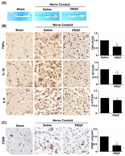 PRGF reduces chronic inflammation and macrophages in nerve conduit. (A) Representative pictures of the harvested sciatic nerves after 6 weeks of transection injury and nerve conduit surgery. (B) Representative immunohistochemistry (IHC) staining images demonstrated the expression levels of TNFα, IL-1β, and IL-6 in the middle region of transverse sectioned nerve tissue were significantly decreased in the rats that received nerve conduit filled with PRGF. (C) The number of M1 macrophages as indicated by the positive marker of CD68 was reduced in PRGF-treated nerve tissue. Scale bar = 20 μm. N = 3. Significance was assessed by paired t-test. Data are presented as the mean ± SEM. * p < 0.05 versus to saline group.