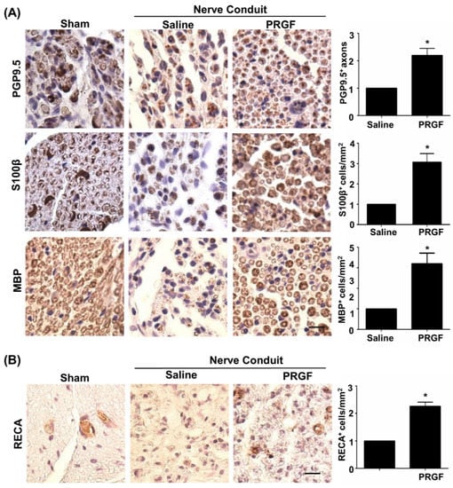 Although PRGF improved nerve healing by restoration of the function in peripheral nerves [32], detailed regenerative assessments on axonal regrowth and remyelination are yet to be delineated. The IHC staining on transverse sections of the middle region of the nerve was carried out for various markers, such as PGP9.5 (axonal regrowth), S100β (the number of SCs), and MBP (myelinated SCs). An increase in PGP9.5-positive axons at the core region of the nerve fiber was seen in the PRGF-treated group, indicating better axonal regrowth by PRGF administration (Figure 4A). Meanwhile, a marked change in the number of SCs was observed in the PRGF-treated nerve compared to the saline group, as reflected by more positively stained S100β cells (brown color) with myelin sheath morphology at 6 weeks post-injury (Figure 4A). The myelination of regrown axons was further demonstrated by the increased number of MBP positively stained cells after PRGF treatment (Figure 4A). In addition to the hint of promoting the M2 macrophage from our in vitro results, we also assessed the possibility of releasing other regenerative factors from the M2d subtype macrophage to produce angiogenic factor VEGF and promote angiogenesis. The IHC stain for the endothelial cell marker RECA-1 showed an increase in the number of RECA-positive cells in the PRGF group compared to the PBS control group (Figure 4B). Thus, both remyelination and angiogenesis were observed in the regenerated nerve after PRGF treatment.