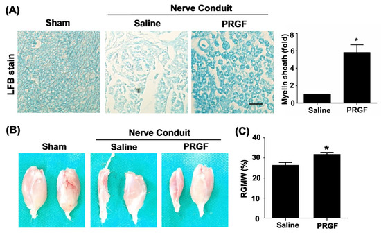Myelin sheath formation and target muscle innervation confirmed the regenerative outcomes at 6 weeks post-sciatic nerve injury. (A) Luxol fast blue (LFB) staining showed an increase in myelin sheath formation for the nerve sections that received PRGF treatment as compared to the saline group. (B) The morphology of sciatic nerve innervated target gastrocnemius muscle on an injured (left) and normal (right) leg demonstrated the improvement of regenerated nerve to reinnervate the target muscle for preventing muscle atrophy. (C) The relative gastrocnemius muscle weight (RGMW) was quantified and showed an improvement in the PRGF-treated rats. Scale bar = 20 μm. N = 3. Significance was assessed by paired t-test. Data are presented as the mean ± SEM. * p < 0.05 versus to saline group.