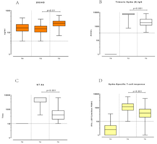 Trend of 25OHD levels (A), Trimeric Spike (S) IgG response (B), and anti-SARS-CoV-2 neutralizing (NT) antibodies (C), and T-cell responses (D) measured at T0, T2, and T3.