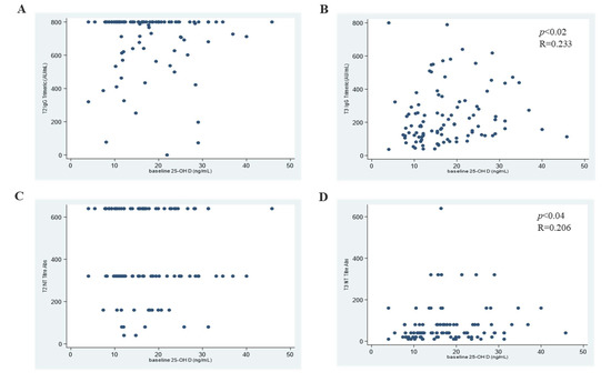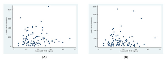 There was no significant association between the baseline 25OHD concentration and S-specific T-cell response at T2 (Spearman R = 0.024; CI95% −0.175–0.222; p = 0.808), nor at T3 (Spearman R = 0.002; CI95% −0.200–0.204; p = 0.984) (Figure 3A,B).