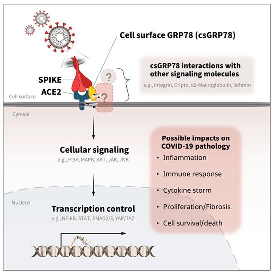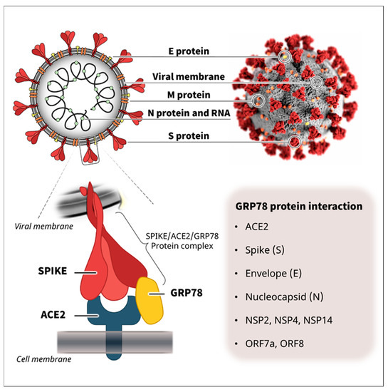 - Gonzalez-Gronow, M.; Gopal, U.; Austin, R.C.; Pizzo, S.V. Glucose-regulated protein (GRP78) is an important cell surface receptor for viral invasion, cancers, and neurological disorders. IUBMB Life 2021, 73, 843–854. [Google Scholar] [CrossRef] [PubMed]
