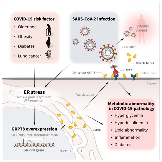 The regulation and metabolic association/implication of GRP78 in COVID-19. Older age, obesity, diabetes, and some types of lung cancer are known to be significant risk factors for COVID-19 severity and mortality [5,6,7,8,9]. Theses pathological conditions increase the expression of GRP78 [21,22,23,61]. SARS-CoV-2 infection is also associated with the overexpression of GRP78 in the lung and circulation [62,74]. The excessive protein production and UPR response in the ER compartment is attributed to GRP78 overexpression via ATF6/XBP1 transcription activity [12,89,90], which triggers the translocation of GRP78 to the cell surface and the circulation [30,31,32]. The excessive expression of GRP78 contributes to metabolic diseases, such as hyperglycemia, hyperinsulinemia, liver steatosis, abnormal lipid control, inflammation, insulin resistance, and diabetes [91,92,93]. Therefore, the infection- and stress-induced GRP78 expression might in part account for the metabolic abnormalities of COVID-19.