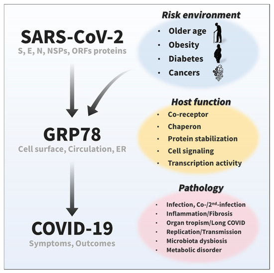 In conclusion, we suggest that GRP78 may be a multi-functional host factor involved in various steps of the SARS-CoV-2 life cycle as co-receptor, chaperone, protein stabilizer, and mediator of cellular signaling and transcription (Figure 5). These emerging and potential roles of GRP78 possibly contribute to the pathology of COVID-19, such as not only the infection, but also inflammation, fibrosis, egress, organ tropism, long COVID, co-/2nd-infection, and metabolic abnormalities. Its expression is highly relevant to the risk factors for severe symptoms and outcomes in COVID-19 patients, such as aging, obesity, diabetes, and lung cancer. Thus, targeting GRP78 could be an efficient preventative and therapeutic strategy for COVID-19 pathology. We hope that this review promotes further attention to and study of GRP78 from many clinical and basic science fields. Sophisticated and detailed research should be performed to assess the potential roles of GRP78 and its associations with COVID-19 pathology, risk, and metabolic impact.