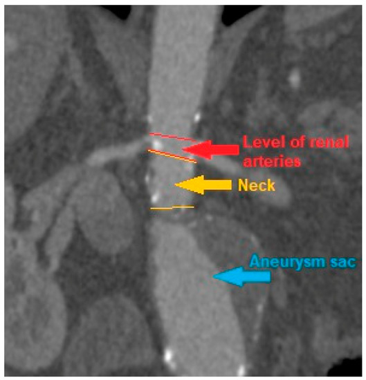 It has not been fully determined if or how profoundly the presence or absence of AAA neck segment should be regarded. The term abdominal aortic aneurysm is defined as any significantly large dilation of the aorta, from the aortic hiatus to the division into the iliac arteries. The majority of these cases are patients with an aneurysm located below the exit of the renal arteries, as in this region the histological structure determines the greater susceptibility of the vascular wall to remodeling into an aneurysm [5,10]. A rarer variant is an aneurysm present in the segment of major visceral arteries departure, and such aneurysms are often treated in clinical practice as a separate disease, not because of a different etiopathogenesis, but a different method of their treatment. However, relatively often there is an indirect variant, i.e., aneurysm, which does not cover the section where the visceral arteries depart from the aorta but begins so close to the renal arteries that there is no undilated section between them and the aneurysm sac, i.e., the neck. In this article, such aneurysms are referred to as non-neck aneurysms. Due to the same localization of aneurysms with and without the neck, in the literature referred to as infrarenal, there are no reasons to exclude non-neck aneurysms from the study group. However, all results and conclusions obtained on the basis of the measurements of the aneurysm neck section should be treated with adequate reserve, as it has not been precisely established whether and when the neck is a physiological section of the vessel or if it is already a primary lesion.