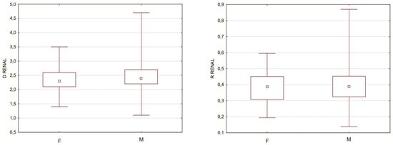 A comparison of aorta diameter (D RENAL) and renal ratio (R RENAL) between women (F) and men (M). D Renal for women from 1.4 to 3.5 cm with majority from 2.1 to 2.6 cm, D Renal for men from 1.1 to 4.7 cm with majority from 2.2 to 2.7 cm. R Renal for women from 0.2 to 0.6 with majority from 0.3 to 0.45, R renal for men from 0.14 to 0.88 with majority form 0.32 to 0.45. All differences insignificant p > 0.05.