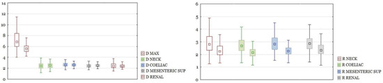 A problem that would not allow for all subjects to be gathered into a single cohort were the potential differences in aortic structure and aneurysm morphology between men and women, which are included in the current guidelines for the treatment of abdominal aortic aneurysms. To determine the validity of such a fusion, among groups of men and women, the separate sex subgroups were extracted, which were characterized by the same minimum and maximum diameter of the aneurysm. There were 17 women and 162 men with a minimum aneurysm diameter of 4.4 cm and a maximum diameter of 9.8 cm. The mean size was 6.4 cm for women and 6.5 cm for men, and the median was 5.8 cm for women and 6.1 cm for men. The aorta diameter above the aneurysm was compared between men and women, and for this purpose, the diameter of the aorta at the level of renal arteries was arbitrarily used for some subjects that did not have the neck segment. To simultaneously take into account the size of the aneurysm, the R Renal was compared as well. The analysis revealed no statistically significant differences both when comparing the diameter and the ratio; therefore, further measurements were made without gender division (Figure 2).