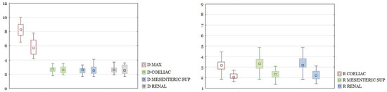 After measuring the diameters, the aortic diameter ratios at certain levels were calculated. The ratios are the quotient of the maximum diameter of AAA and the diameter of the aorta at the level of the celiac trunk, the superior mesenteric artery, the renal arteries, the diameter of both common iliac arteries, and the diameter of both external iliac arteries. The ratios were named as the “R” and the name of the artery at the level of which the aortic diameter was measured, or the common and external iliac artery with the additional definition of the side.
