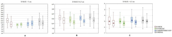 As mentioned above, the test and control groups were divided into size ranges (<5; 5–6.5; >6.5 cm) and the previous calculations were made for each subgroup separately. In the group of subjects with the present aneurysm neck segment, the maximum size of the aneurysm differed significantly between the test and control groups in the size ranges of the aneurysm sac <5 cm and 5–6.5 cm. When comparing the difference in the ratios, for aneurysms smaller than 5 cm in diameter, significant differences were shown only for Ratio Neck. In the size range from 5–6.5 cm, the following ratios were significantly different: Ratio Celiac, Mesenteric, Renal, Neck, Left Iliac comm and Left iliac ext, with the difference of the latter two being less pronounced. For aneurysms larger than 6.5 cm in diameter, significant differences were shown only for the Ratio Neck (Figure 6).