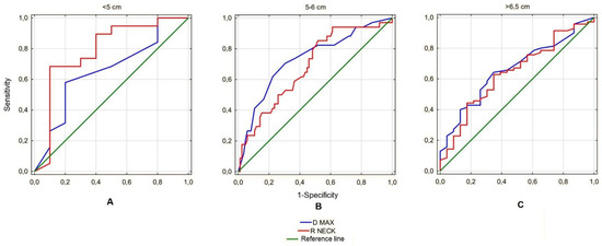(A) ROC curves for the predictive value of R NECK compared with D MAX and the reference line in the group of aneurysms with D MAX < 5 cm. AUC for D MAX: 0.65, AUC for R NECK: 0.783. (B) ROC curves for the predictive value of R NECK compared with D MAX and the reference line in the group of aneurysms with D MAX 5–6.5 cm. AUC for D MAX: 0.729, AUC for R NECK: 0.68. (C) ROC curves for the predictive value of R NECK compared with D MAX and the reference line in the group of aneurysms with D MAX > 5 cm. AUC for D MAX: 0.658, AUC for R NECK: 0.641.