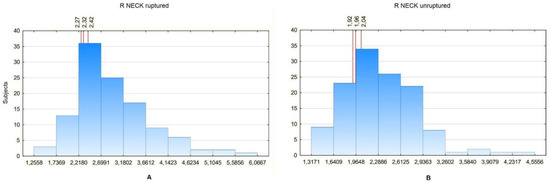 (A) R NECK values distribution in a certain number of patients with ruptured aneurysm. For the 20th percentile: 2.27, 25th percentile: 2.32, 30th percentile: 2.42. (B) R NECK values distribution in a certain number of patients with unruptured aneurysm. For the 20th percentile: 1.92, 25th percentile: 1.96, 30th percentile: 2.04.