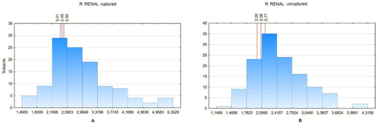 (A) R RENAL values distribution in a certain number of patients with ruptured aneurysm with neck segment absent. For the 20th percentile: 2.78, 25th percentile: 3, 30th percentile: 3. (B) R RENAL values distribution in a certain number of patients with unruptured aneurysm with neck segment absent. For the 20th percentile: 1.82, 25th percentile: 1.91, 30th percentile: 2.