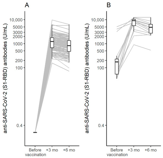 Antibody titer before vaccination and 3 and 6 months after the second dose of the BNT162b2 vaccine: (A) in people with cystic fibrosis naïve to the virus; (B) in people with cystic fibrosis previously infected by SARS-CoV-2. Grey lines indicate individual antibody responses, while box plots show their distribution at different time points (before vaccination, 3 and 6 months after second injection).