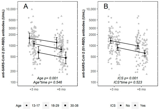Antibody titer at 3 and 6 months after the second dose of the BNT162b2 vaccine in people with cystic fibrosis naïve to SARS-CoV-2, according to age group (A) and inhaled corticosteroid treatment (B). Grey symbols indicate individual data, black symbols and error bars show the estimated mean values and corresponding 95% confidence intervals obtained from mixed-effect regression models. p-values indicate the statistical significance of the main effects of the age group and inhaled corticosteroid treatment and their interaction with time (3- or 6-month post-vaccination).
