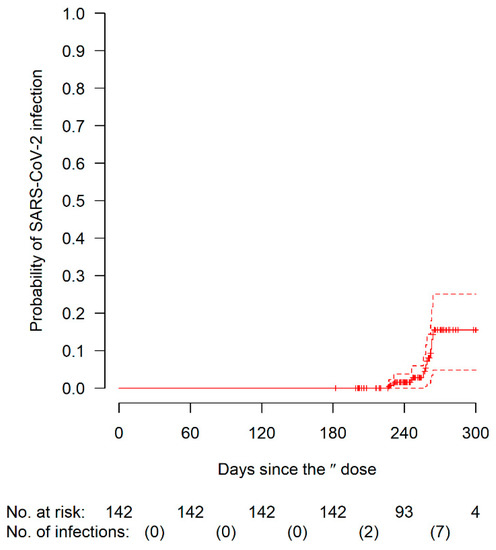 Figure 3 shows the cumulative incidence of post-vaccination SARS-CoV-2 infection after the second dose of the vaccine. Among the 142 patients with available information on infection status at follow-up, 9 patients were infected by SARS-CoV-2 before receiving the third dose of the vaccine. The cumulative incidence at day 240 was 1.6% (95% CI: 0–3.8%) and at the last observed event time (day 264) was 15.6% (95% CI: 4.8–25.1%). However, by that time, most patients had received the third dose. The majority of infections (n = 7, 77.8%) occurred between day 240 and day 264, 2 infections occurred between day 180 and 240, none before day 180. Eight patients had mild COVID-19, and one required hospitalization. Antibody titer at 6 months from the second dose was not associated with a significant reduction in the infection rate (HR for one-point increment in log-10 antibody titer: 0.91, 95% CI: 0.20–4.21), although this analysis is limited by the low number of events.