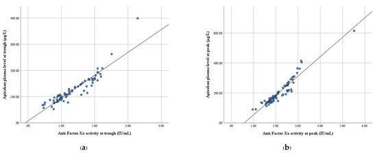 The relationship between the apixaban plasma levels and LMWH-calibrated anti-FXa activities was analyzed using Spearman’s rank correlation (ρ) and simple linear regression. Statistical significance was considered at a p-value of <0.05.