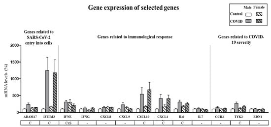 Expression levels of selected genes in PBCs in male and female control subjects and COVID-19 patients. mRNA levels were measured by real-time qPCR and expressed as a percentage of the value of control males. Data are expressed as the mean ± SEM of 15–43 samples per group. Statistics: C, effect of COVID; CxS, interaction between COVID and sex (p < 0.05, two-way ANOVA).