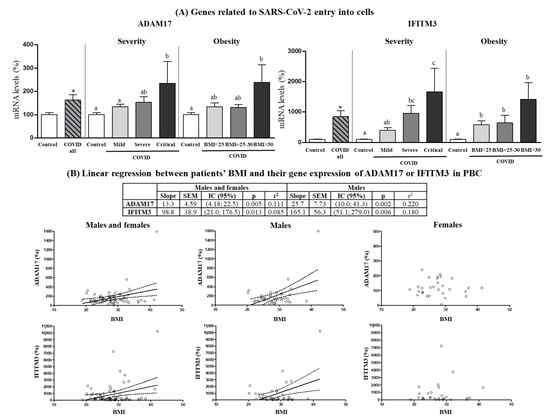 (A) Expression levels in PBCs of the indicated genes related to SARS-CoV-2 entry into cells in control subjects and COVID-19 patients (all) and separated according to COVID-19 severity and obesity. (B) Linear regression between patients’ BMI and their gene expression in PBCs of ADAM17 or IFITM3. mRNA levels were measured by real-time qPCR and expressed as a percentage of the value of Controls (males and females). Data are expressed as the mean ± SEM. Statistics: differences between stratified groups were analyzed by one-way ANOVA followed by least significant difference (LSD) post-hoc test, a ≠ b ≠ c (p < 0.05). Student’s t test was used for single comparisons: *, COVID all vs Control.
