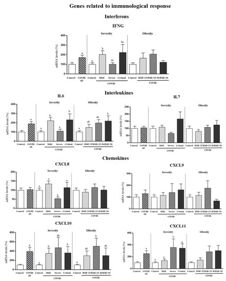 Expression levels in PBCs of the indicated genes related to immunological response in control subjects and COVID-19 patients (all) and separated according to COVID-19 severity and obesity. Pooled data from males and females are shown since no sex effects or sex × COVID interactive effects were detected for the indicated genes. mRNA levels were measured by real-time qPCR and expressed as a percentage of the value of control subjects (male and female). Data are expressed as the mean ± SEM. Statistics: differences between stratified groups were analyzed by one-way ANOVA followed by least significant difference (LSD) post-hoc test, a ≠ b ≠ c (p < 0.05). Student’s t test was used for single comparisons: *, COVID all vs Control.