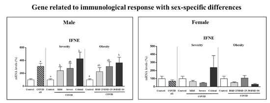 Expression levels in PBCs of the indicated gene related to immunological response in controls and COVID-19 patients (male and female) and separated according to COVID-19 severity and obesity in each sex. mRNA levels were measured by real-time qPCR and expressed as a percentage of the value of the respective control sex (male or female). Data are expressed as the mean ± SEM. Statistics: differences between stratified groups were analyzed by one-way ANOVA followed by least significant difference (LSD) post-hoc test, a ≠ b (p < 0.05). Student’s t test was used for single comparisons: *, COVID all vs Control.