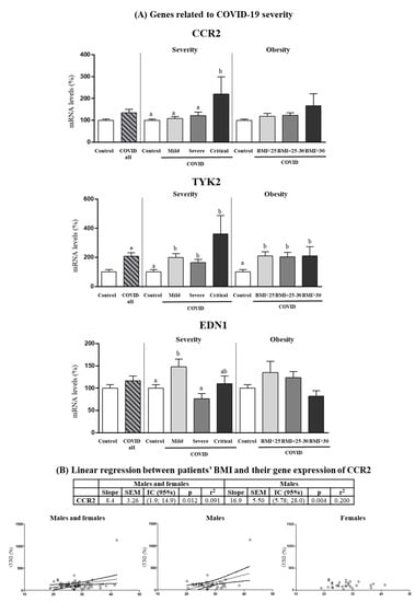CCR2, EDN1 and TYK2 genes were analyzed for mRNA expression in PBCs given their previously described relation with COVID-19 severity [22,23] (Figure 5). PBCs CCR2 mRNA levels were similar in COVID-19 patients and control subjects when all patients were considered but were greater in critical patients as compared to controls or less severe patient groups (one-way ANOVA, post-hoc analysis). Despite no differences were observed among BMI ranges, CCR2 gene expression levels in PBCs of patients were predicted by BMI, particularly in the male patients (Figure 5B), in which for each unit of increase in BMI, gene expression increased by 16.9 ± 5.50 units. They were also predicted by BMI in PBCs of the control subjects, albeit only when pooling both sexes and with a lower slope value (2.00 ± 0.76) (p = 0.012; r2 = 0.147).