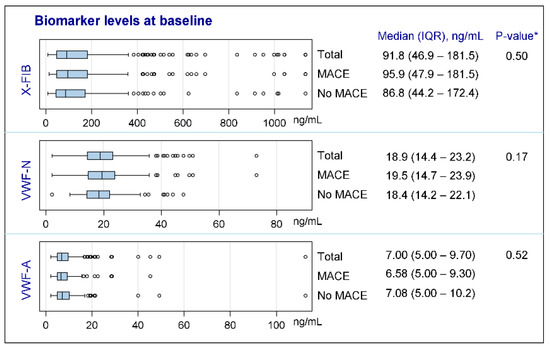 Characteristics of biomarkers at baseline. X-FIB: Cross-linked fibrin degeneration. VWF-N: N-terminal of von Willebrand Factor formation. VWF-A: Neoepitope of ADAMTS13-mediated activation of von Willebrand Factor. IQR: Interquartile range. MACE: Major cardiovascular event. *: For comparison between ‘MACE’ and ‘No MACE’ subgroups.