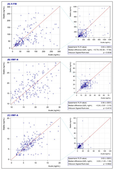 None of the biomarkers were normally distributed; see Figure 2 for characteristics of the biomarkers at baseline. Both vWF markers were generally unchanged from exacerbation to the stable phase (VWF-N: p = 0.41, VWF-A: p = 0.68), whereas there was a decrease in the stable phase for the clot resolution marker, X-FIB, with a median difference of 10.74 ng/mL (IQR: −60.36–17.99, p = 0.0038); Figure 3A–C. X-FIB and VWF-A had a strong correlation from the acute to stable phase, whereas VWF-N had a moderate correlation; Figure 3A–C.