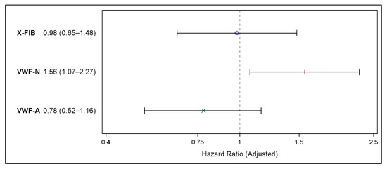 Adjustments for known and suspected confounding factors did not change our findings: Neither X-FIB nor VWF-A predicted future MACE, X-FIB (HR 0.98 (95% CI 0.65–1.48), p = 0.93), and VWF-A: (HR 0.78 (95% CI 0.52–1.16), p = 0.21), whereas VWF-N (HR 1.56 (95% CI 1.07–2.27), p = 0.02) significantly predicted future MACE (Figure 4).