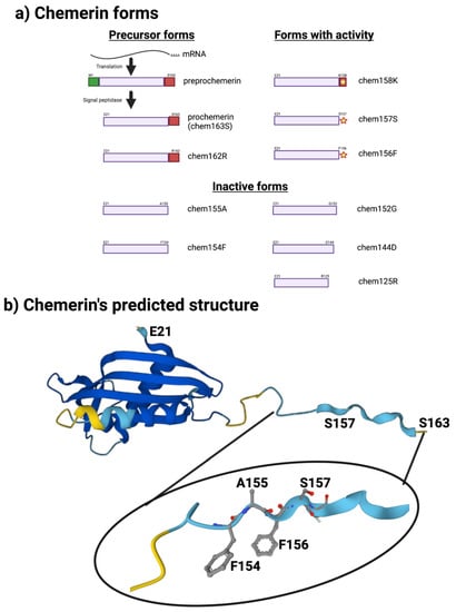 Chemerin forms and chemerin’s predicted structure. Created with BioRender.com. (a) Chemerin forms that have been identified in biopsy samples are grouped into those that are precursors with no intrinsic activity but can be activated by appropriate proteolysis, those that are active, and those are inactive. (b) The structure of chemerin predicted by AlphaFold [15,16] with the darker blue colors representing higher per-residue confidence in the prediction with a magnification of the C-terminal tail.