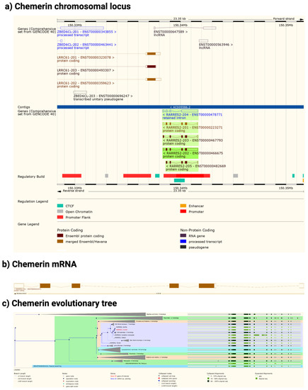 Chemerin gene (Rarres2), mRNA, and evolutionary tree. (a) Chromosomal neighborhood of the chemerin gene on chromosome 7. Chemerin in green on anti-sense strand. (b) Chemerin mRNA with 6 exons in boxes, filled if coding. (c) Evolutionary tree for the chemerin gene. Figures created from data in EMSEMBL human genome build GRCH38.p13 (https://ensembl.org/Homo_sapiens accessed on 11 August 2022).