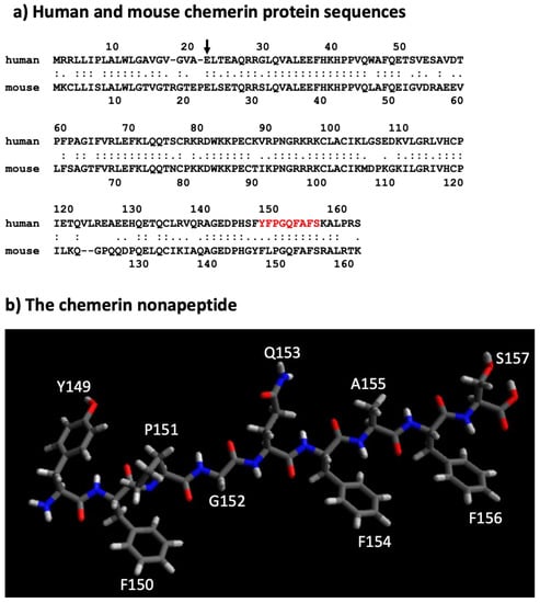 Sequences of mouse and human chemerin and structure of nonapeptide. (a) Mouse and human chemerin protein sequences. The arrow marks the site of cleavage by the signal peptidase, and the amino acid residues highlighted in red represent the nonapeptide. (b) chemerin nonapeptide.