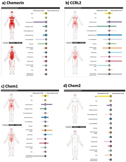 Expression of the components of the chemerin system in different tissues, on the left showing the mRNA expression data for each in normalized transcripts per million (nTPM), and on the right, where available, the score is the protein expression data based on immunohistochemical data manually scored with regard to staining intensity (negative, weak, moderate or strong) and fraction of stained cells (<25%, 25–75% or >75%). Each combination of intensity and fractions is automatically converted into a protein expression level score as follows: negative—not detected; weak <25%—not detected; weak combined with either 25–75% or 75%—low; moderate <25%—low; moderate combined with either 25–75% or 75%—medium; strong <25%—medium, strong combined with either 25–75% or 75%—high. In addition to this, protein expression values are manually adjusted as necessary when evaluated by our expert annotators. (a) chemerin (RARRES2), (b) CCRL2, (c) chem1 (CMKLR1) and (d) chem2 (GPR1). Data from the Human Protein Atlas v21.1 [60] (https://www.proteinatlas.org/ENSG00000106538-RARRES2/tissue, https://www.proteinatlas.org/ENSG00000174600-CMKLR1/tissue, https://www.proteinatlas.org/ENSG00000121797-CCRL2/tissue and https://www.proteinatlas.org/ENSG00000183671-GPR1/tissue accessed on 11 August 2022).